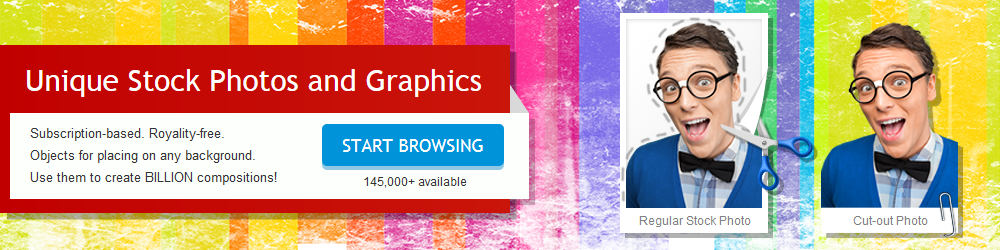 - Stock Photo Library, which includes unique cut-out photo objects to be placed on any backgrounds.